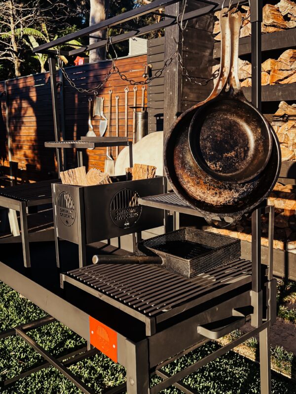 Cure once, then season naturally. Scrape and brush clean. Spray surfaces with oil after cooking. Use a Smokin’ Gauchos Cover. See Care Guide for details.